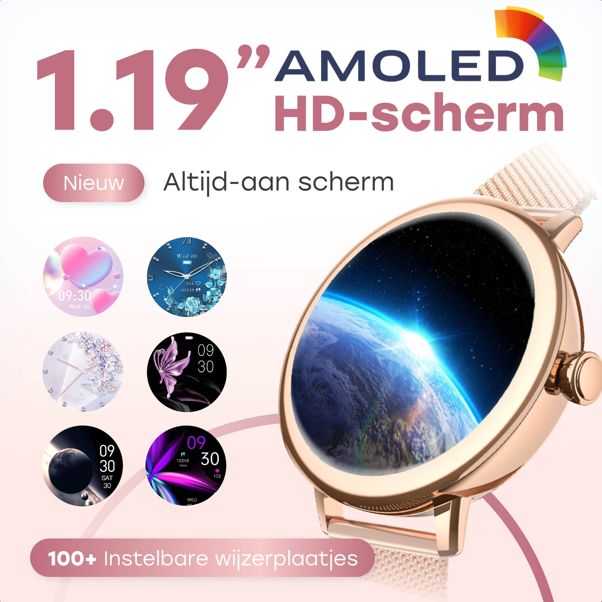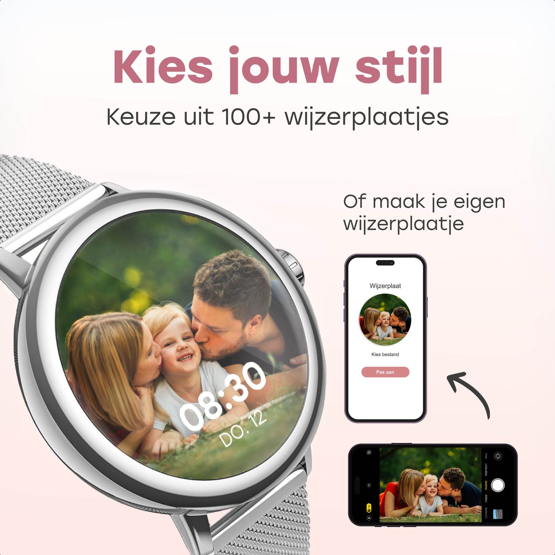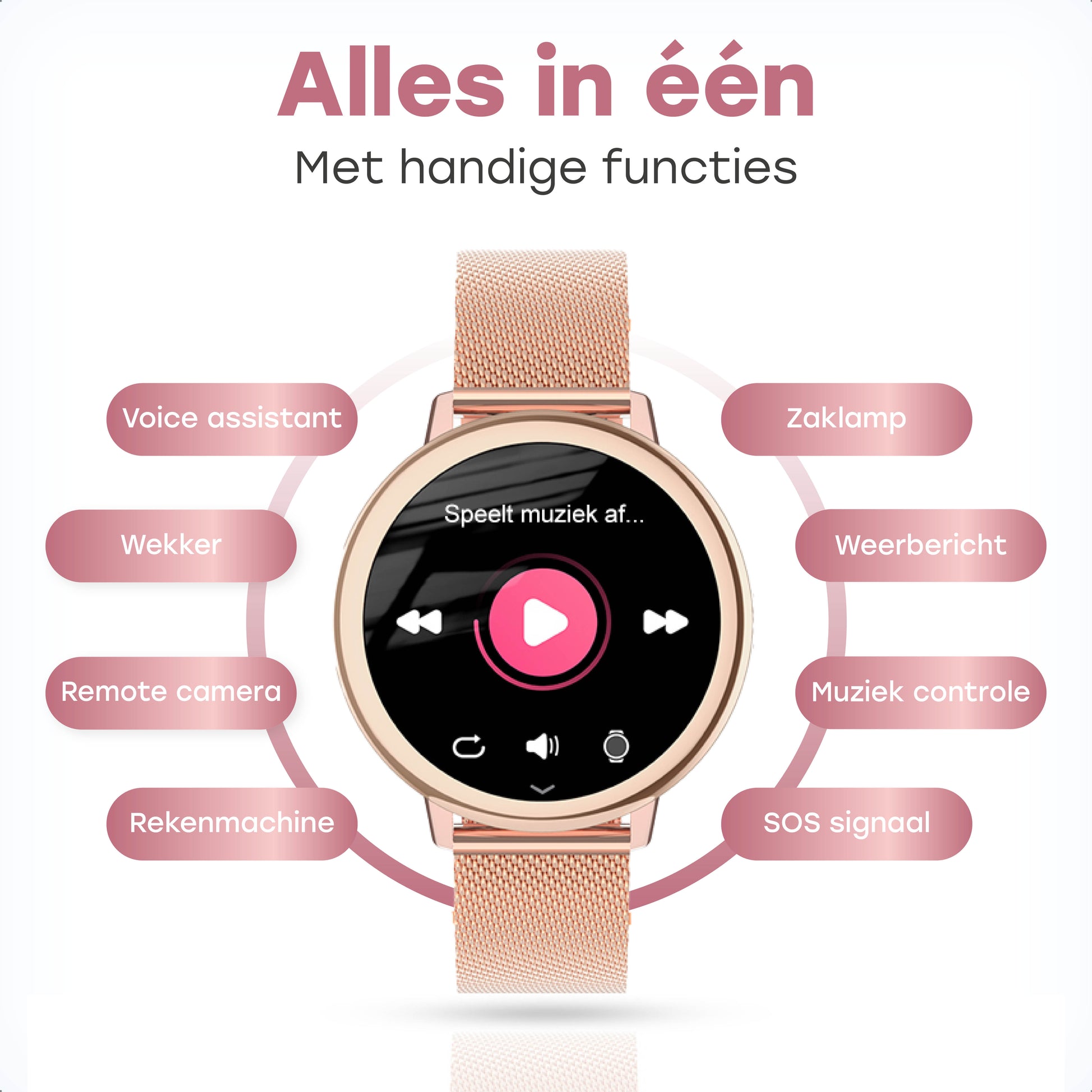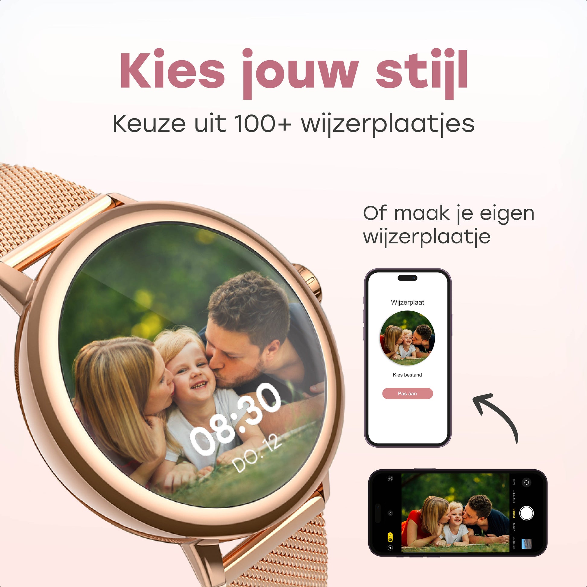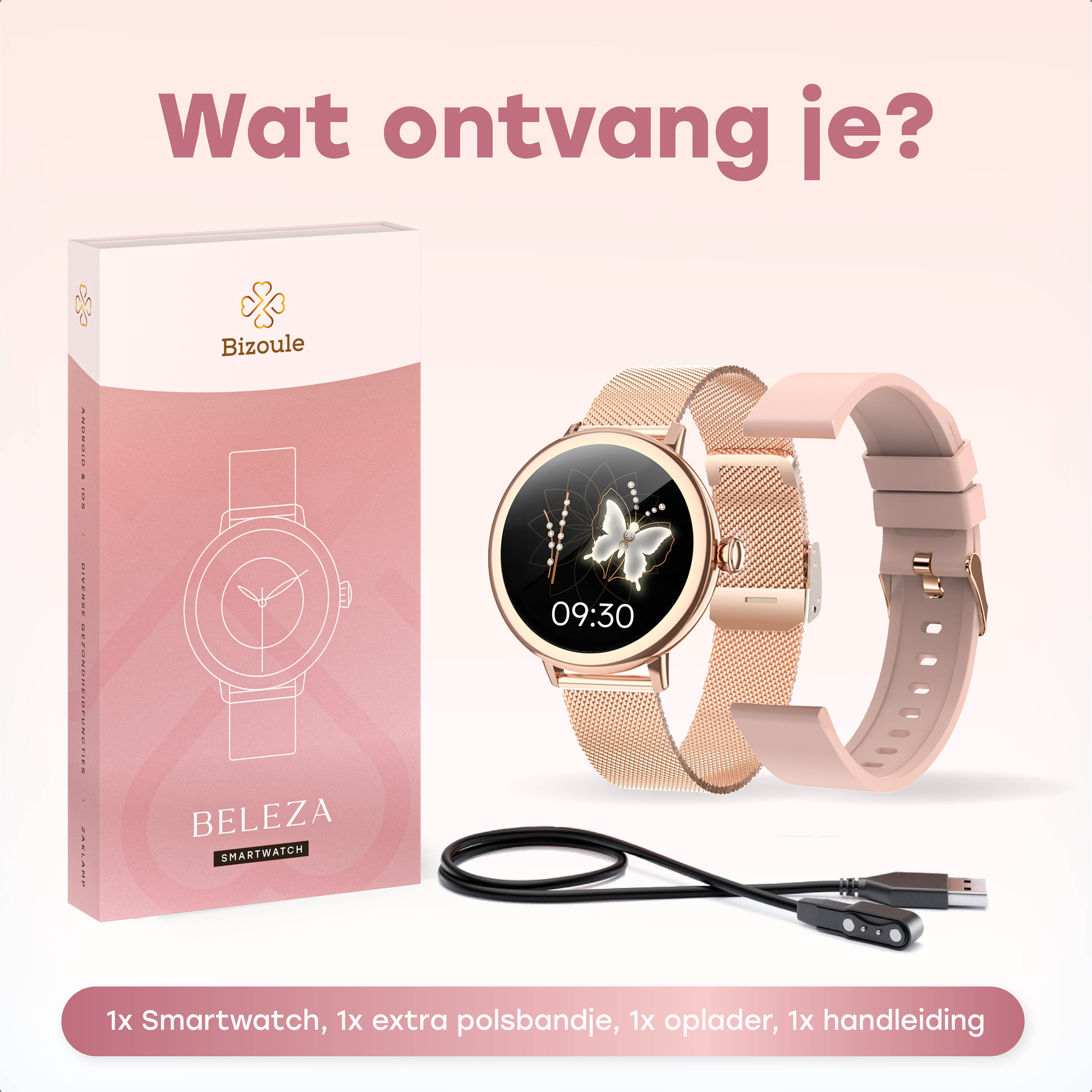Op zoek naar een smartwatch die zowel elegant als slim is? De Beleza Smartwatch van Bizoule is precies wat je nodig hebt! Met een 1,19 inch Amoled scherm en een slank, verfijnd design in Rosé-Goud, is dit horloge een lust voor het oog. Met keuze uit 100+ wijzerplaatjes en de mogelijkheid om zelf een foto in te stellen, heb je altijd de perfecte match voor elke gelegenheid. En met onmisbare smartfuncties zoals berichten lezen en handsfree bellen, blijf je altijd verbonden. Met de Beleza Smartwatch wordt stijl gecombineerd met functionaliteit.