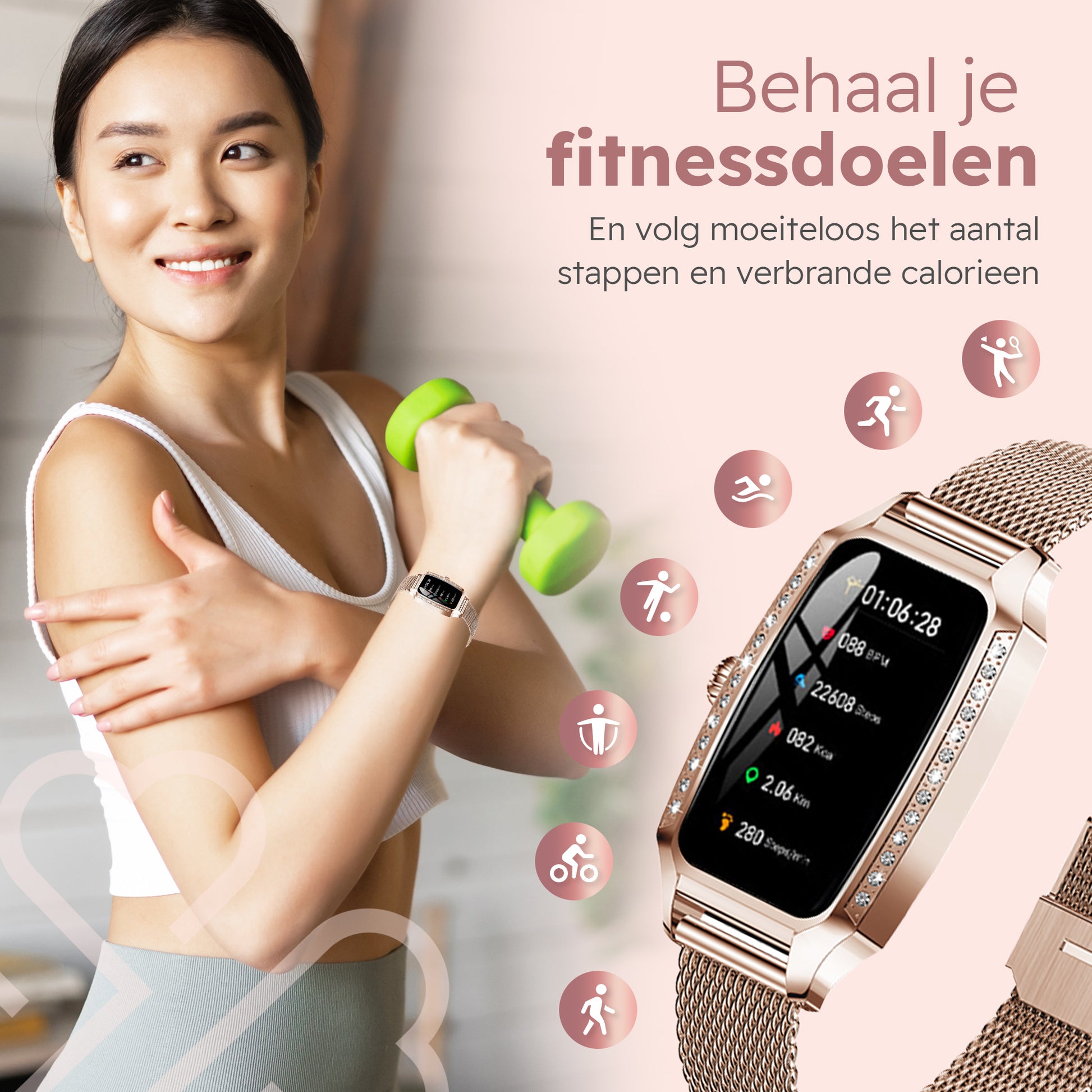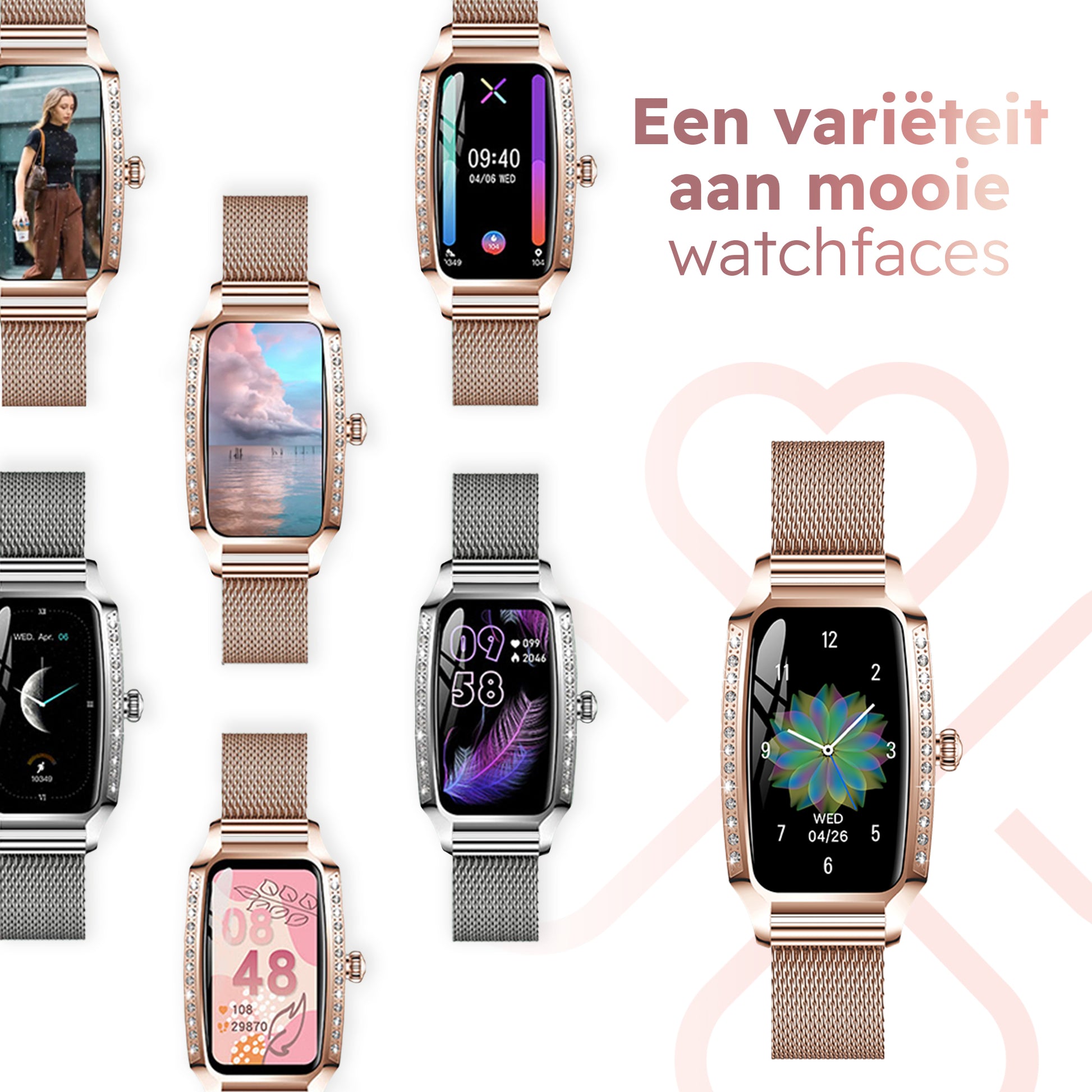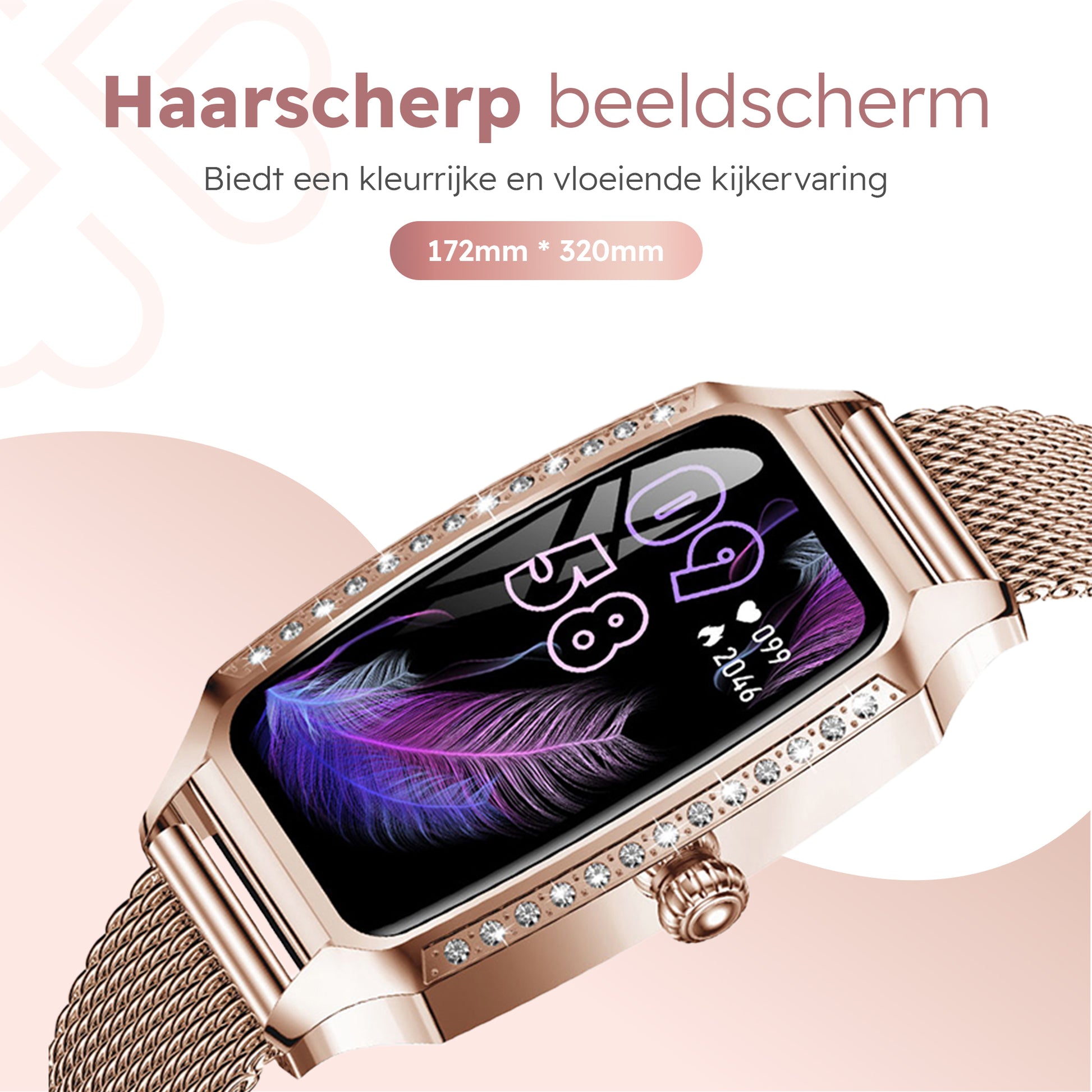 Ben je op zoek naar een stijlvolle hightech smartwatch met de nieuwste technische snufjes, talloze verschillende functies en hoge kwaliteit? Dit stijlvolle horloge in een prachtige zacht roségouden kleur ziet er niet alleen prachtig uit om je pols, het geeft je ook een uniek inzicht in jezelf en je gezondheid! Daarnaast heeft het veel leuke extra's. Je kunt bijvoorbeeld je eigen wijzerplaat ontwerpen, op afstand foto's maken door met het horloge te schudden en direct al je apps en berichten lezen. Het IPS touchscreen zorgt voor een superscherp HD-beeld met prachtige kleuren. En dankzij de krachtige batterij en het Full-Touchscreen ervaar je het ultieme gebruiksgemak.