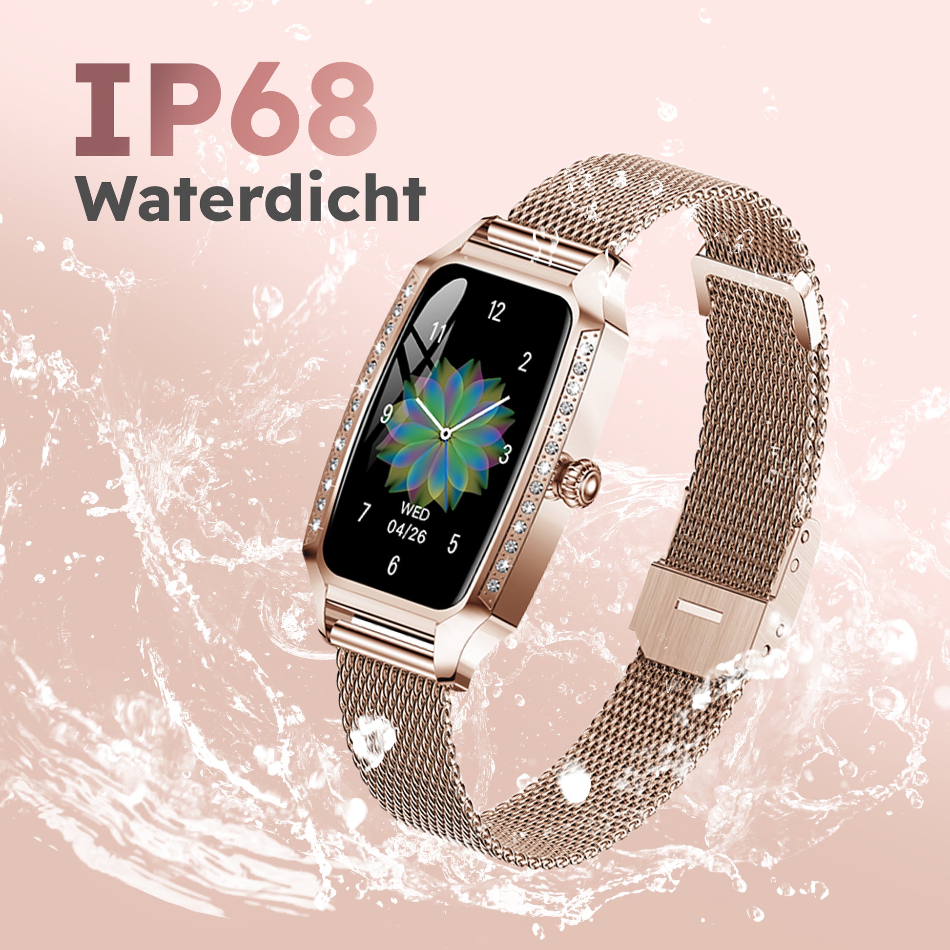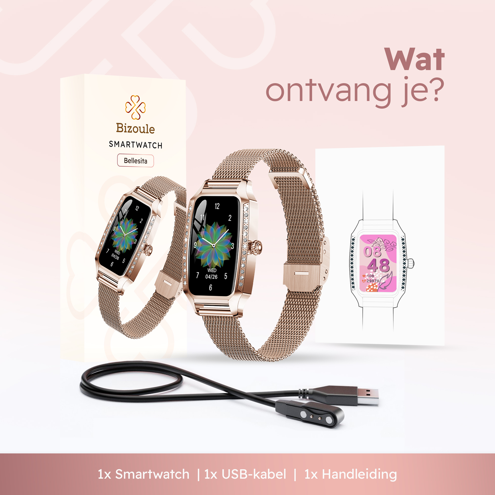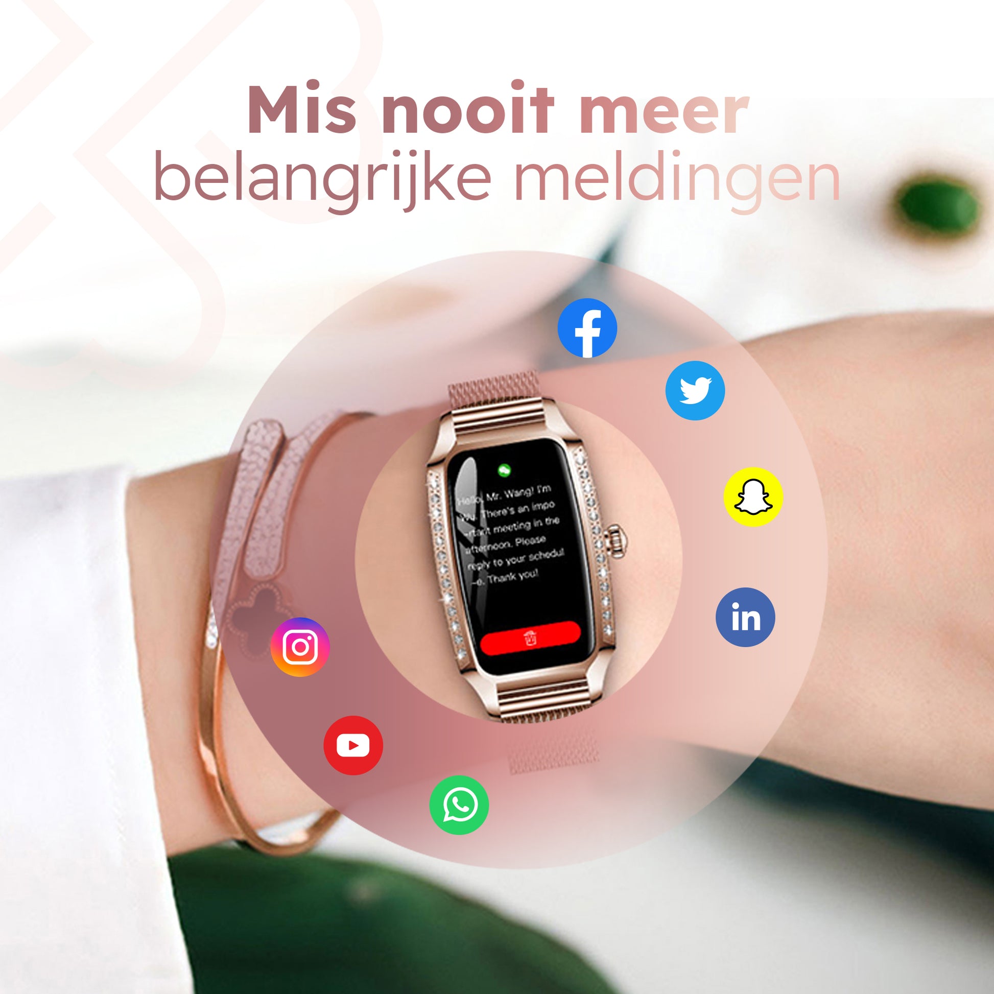 Ben je op zoek naar een stijlvolle hightech smartwatch met de nieuwste technische snufjes, talloze verschillende functies en hoge kwaliteit? Dit stijlvolle horloge in een prachtige zacht roségouden kleur ziet er niet alleen prachtig uit om je pols, het geeft je ook een uniek inzicht in jezelf en je gezondheid! Daarnaast heeft het veel leuke extra's. Je kunt bijvoorbeeld je eigen wijzerplaat ontwerpen, op afstand foto's maken door met het horloge te schudden en direct al je apps en berichten lezen. Het IPS touchscreen zorgt voor een superscherp HD-beeld met prachtige kleuren. En dankzij de krachtige batterij en het Full-Touchscreen ervaar je het ultieme gebruiksgemak.