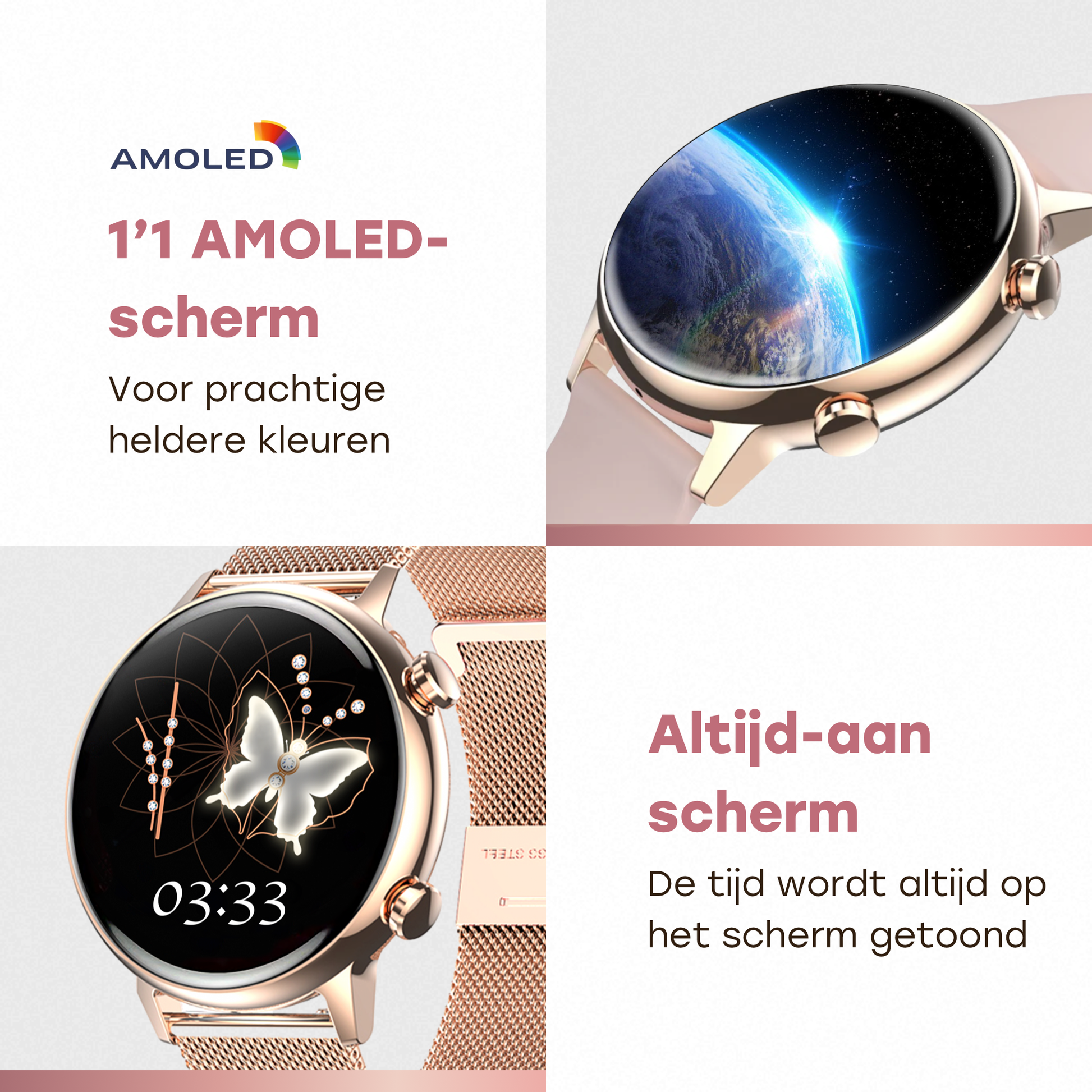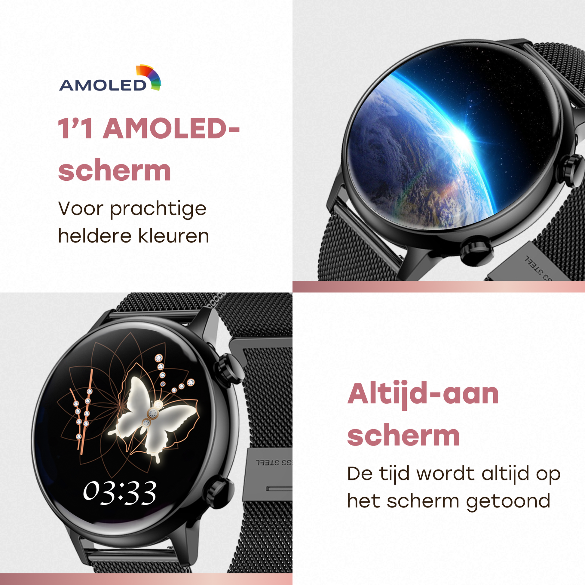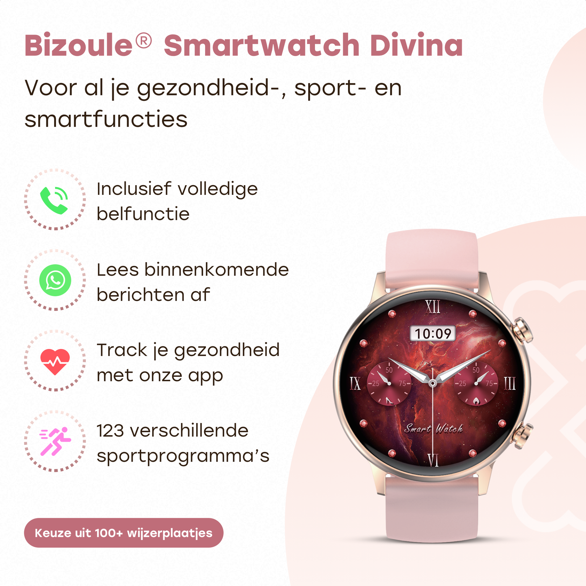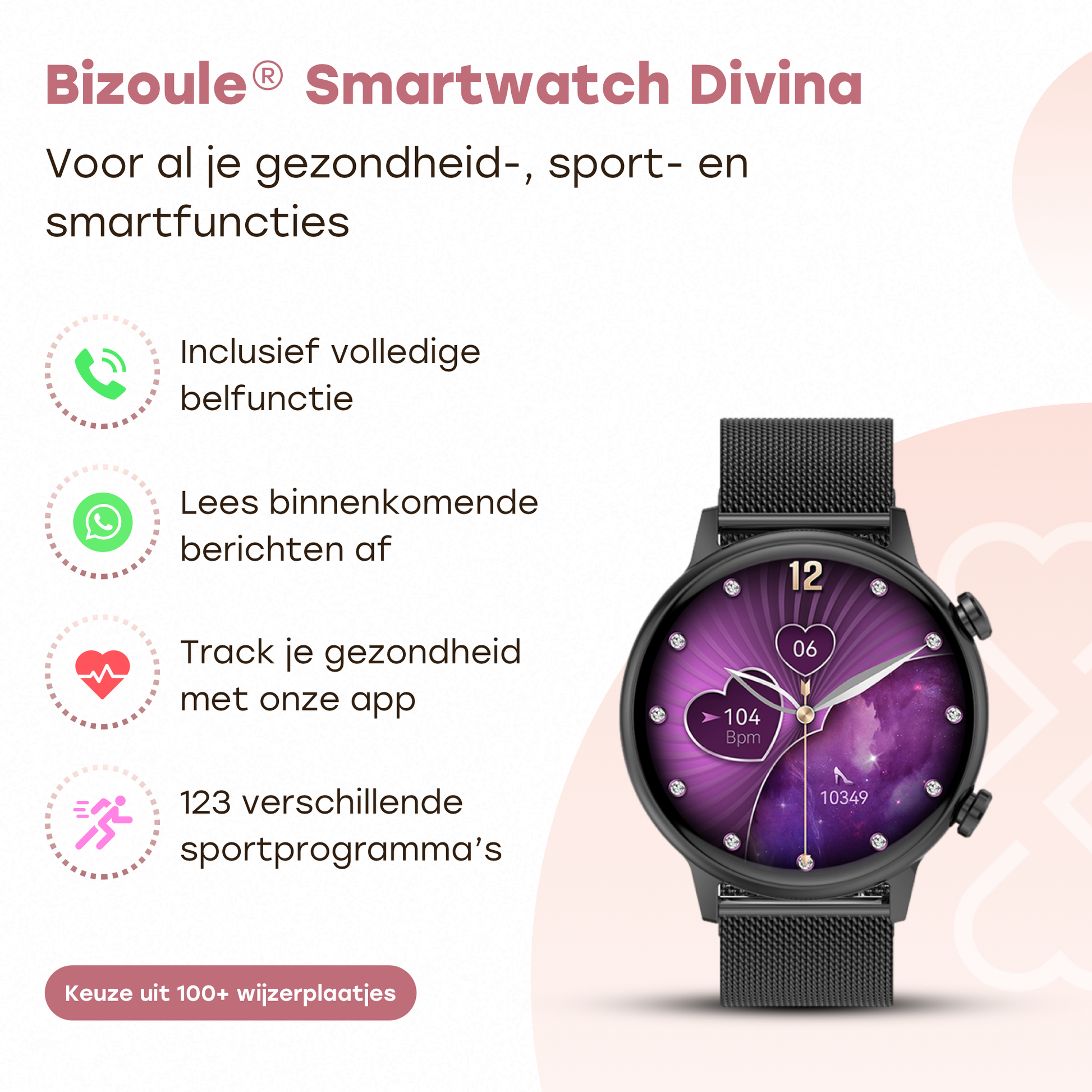 Op zoek naar een smartwatch die niet alleen functioneel is, maar er ook nog eens stijlvol uitziet? Ontdek de Smartwatch Divina van Bizoule! Met een 1,1 inch 360x360 Amoled scherm geniet je van haarscherpe beelden. Bovendien kun je met deze smartwatch handsfree bellen, berichten lezen én kiezen uit 100+ wijzerplaatjes. Dankzij de vele gezondheidsfuncties en sportmodi ben je altijd op de hoogte van je hartslag, stappen en calorieën. Met de Smartwatch Divina haal je een complete assistent om je pols!