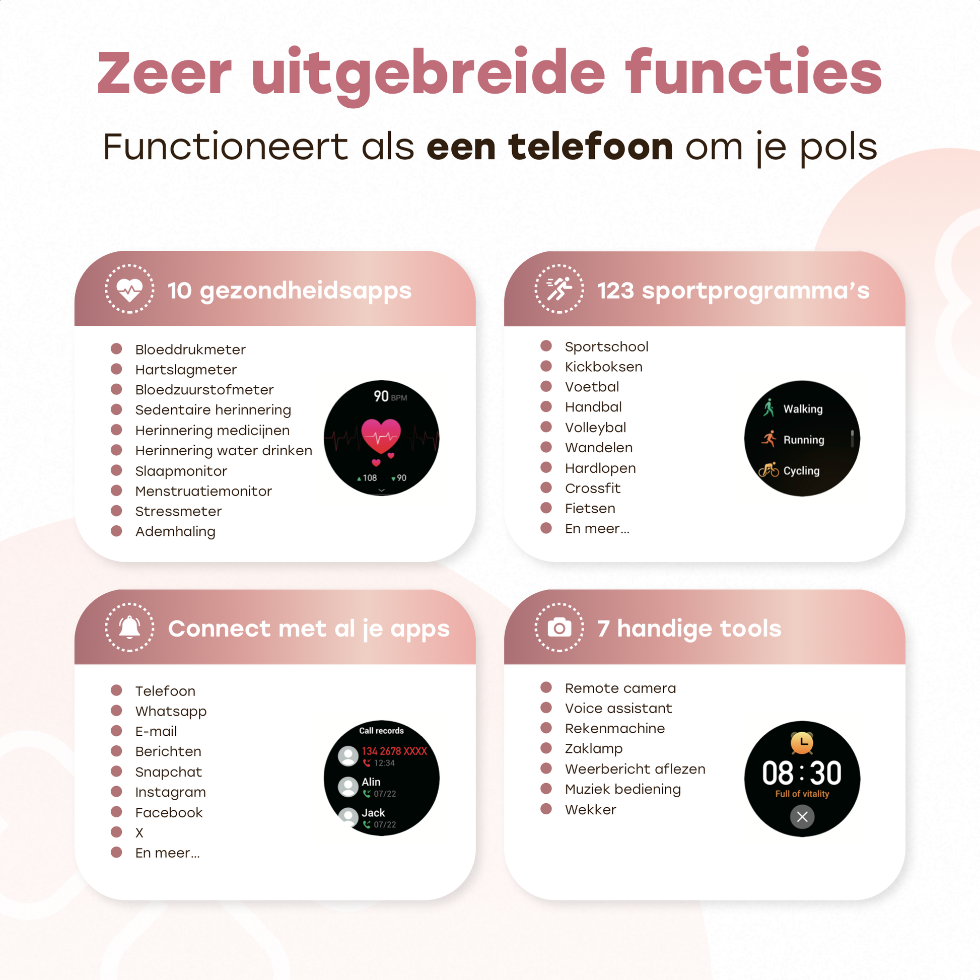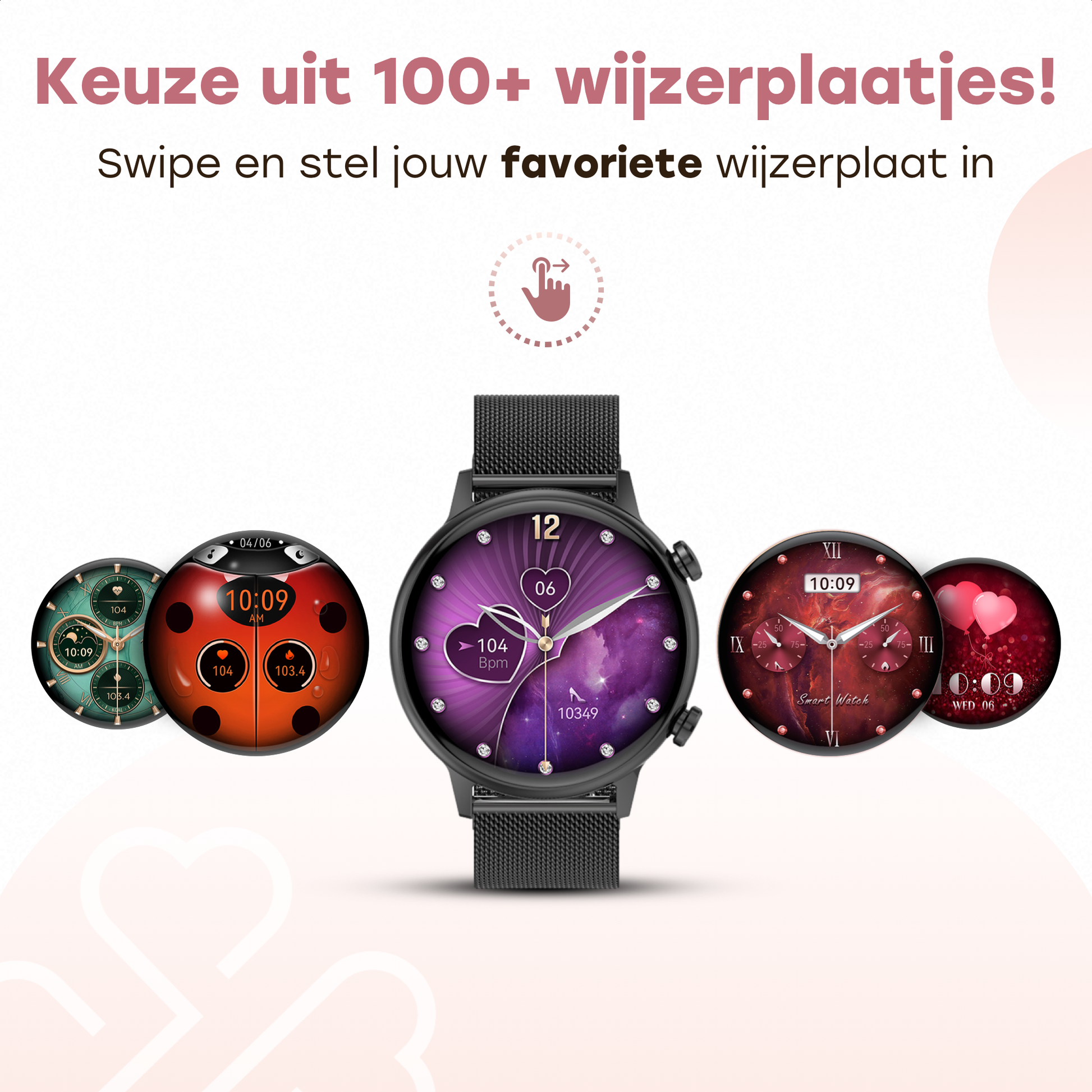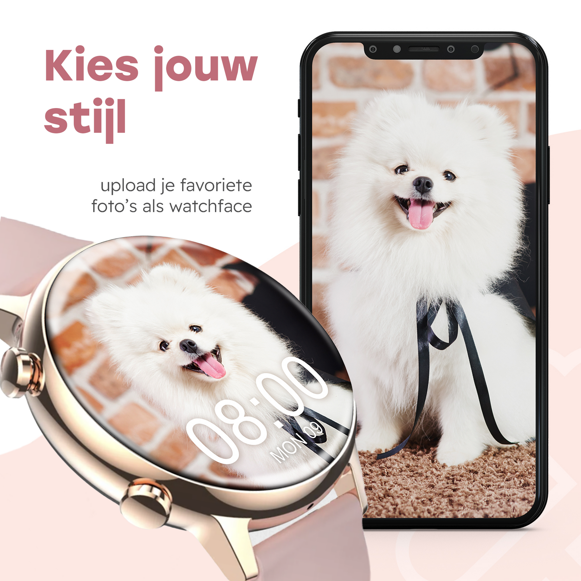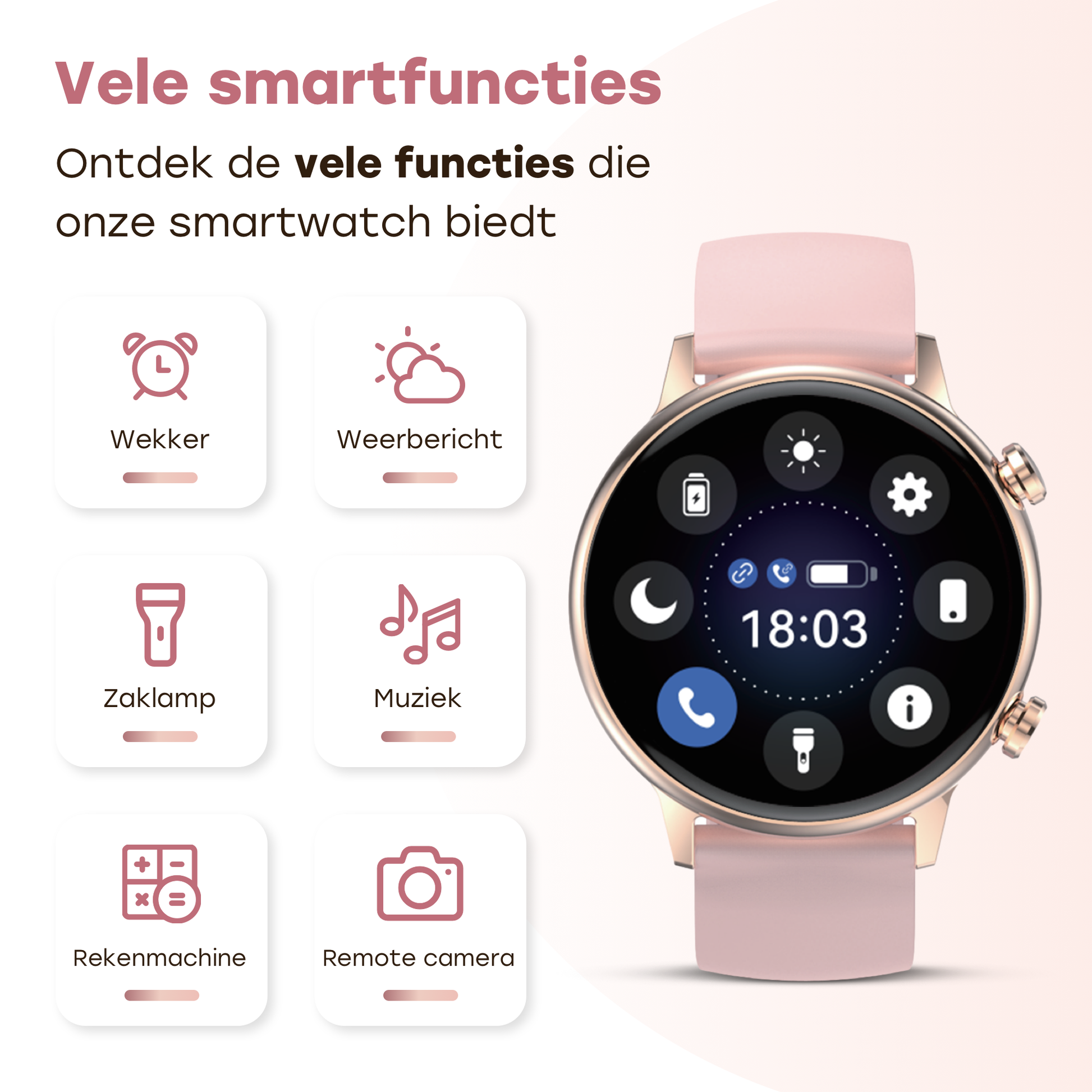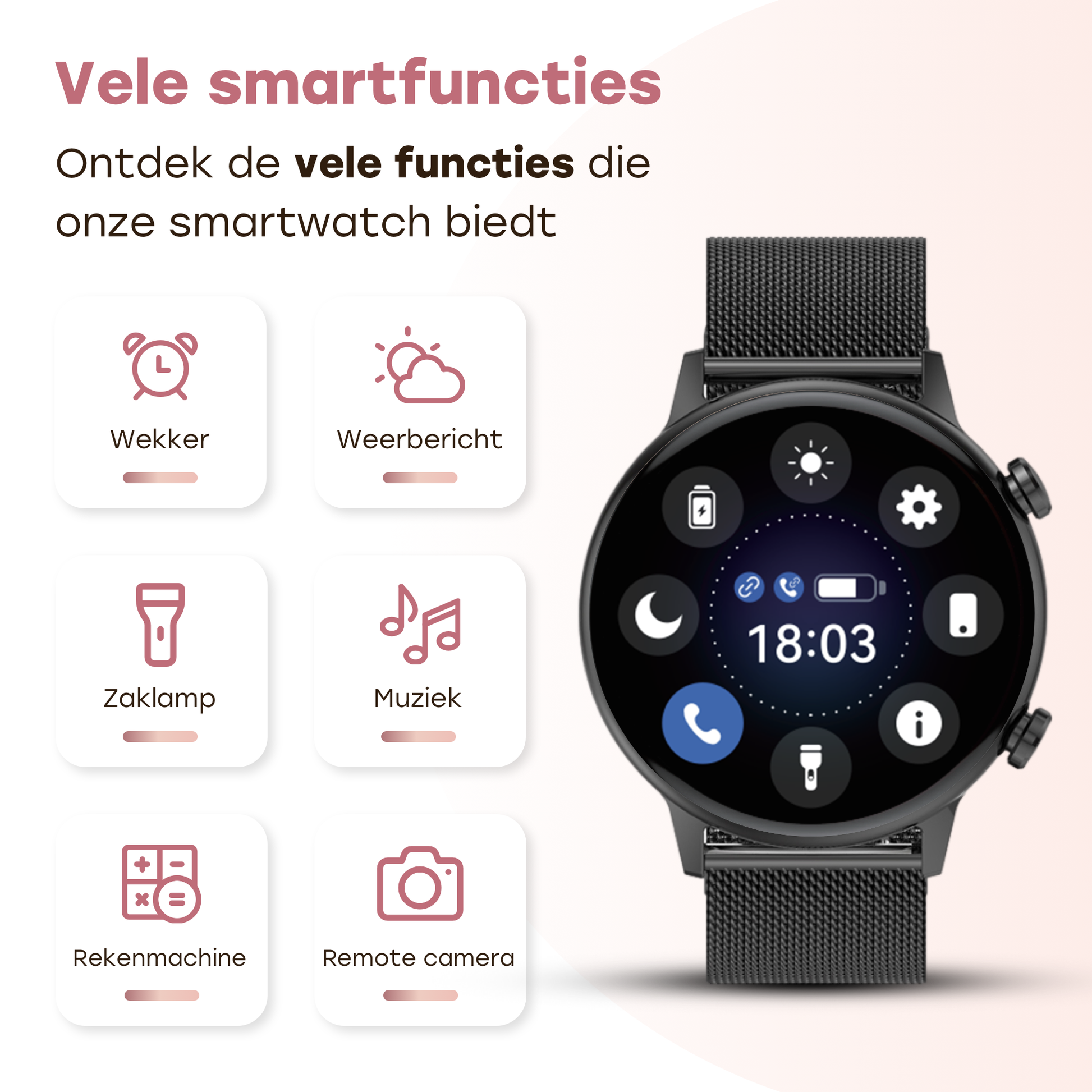 Op zoek naar een smartwatch die niet alleen functioneel is, maar er ook nog eens stijlvol uitziet? Ontdek de Smartwatch Divina van Bizoule! Met een 1,1 inch 360x360 Amoled scherm geniet je van haarscherpe beelden. Bovendien kun je met deze smartwatch handsfree bellen, berichten lezen én kiezen uit 100+ wijzerplaatjes. Dankzij de vele gezondheidsfuncties en sportmodi ben je altijd op de hoogte van je hartslag, stappen en calorieën. Met de Smartwatch Divina haal je een complete assistent om je pols!