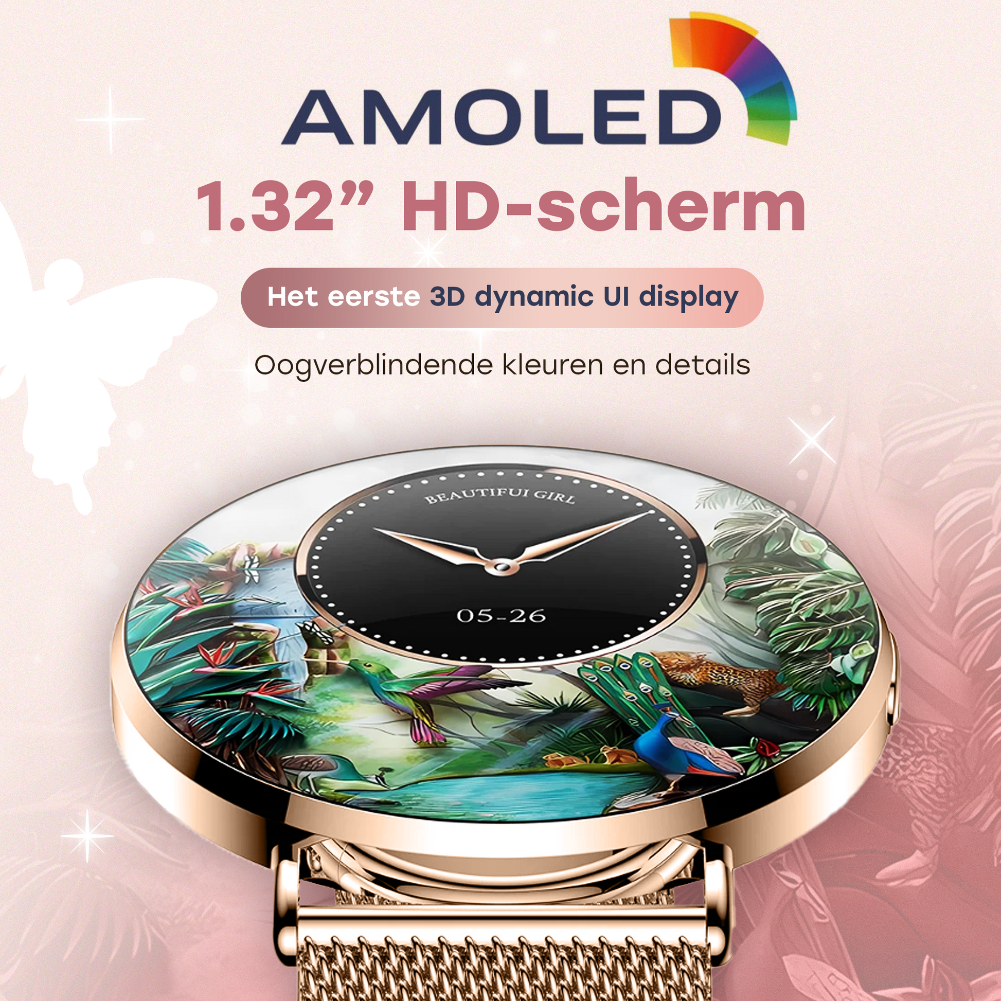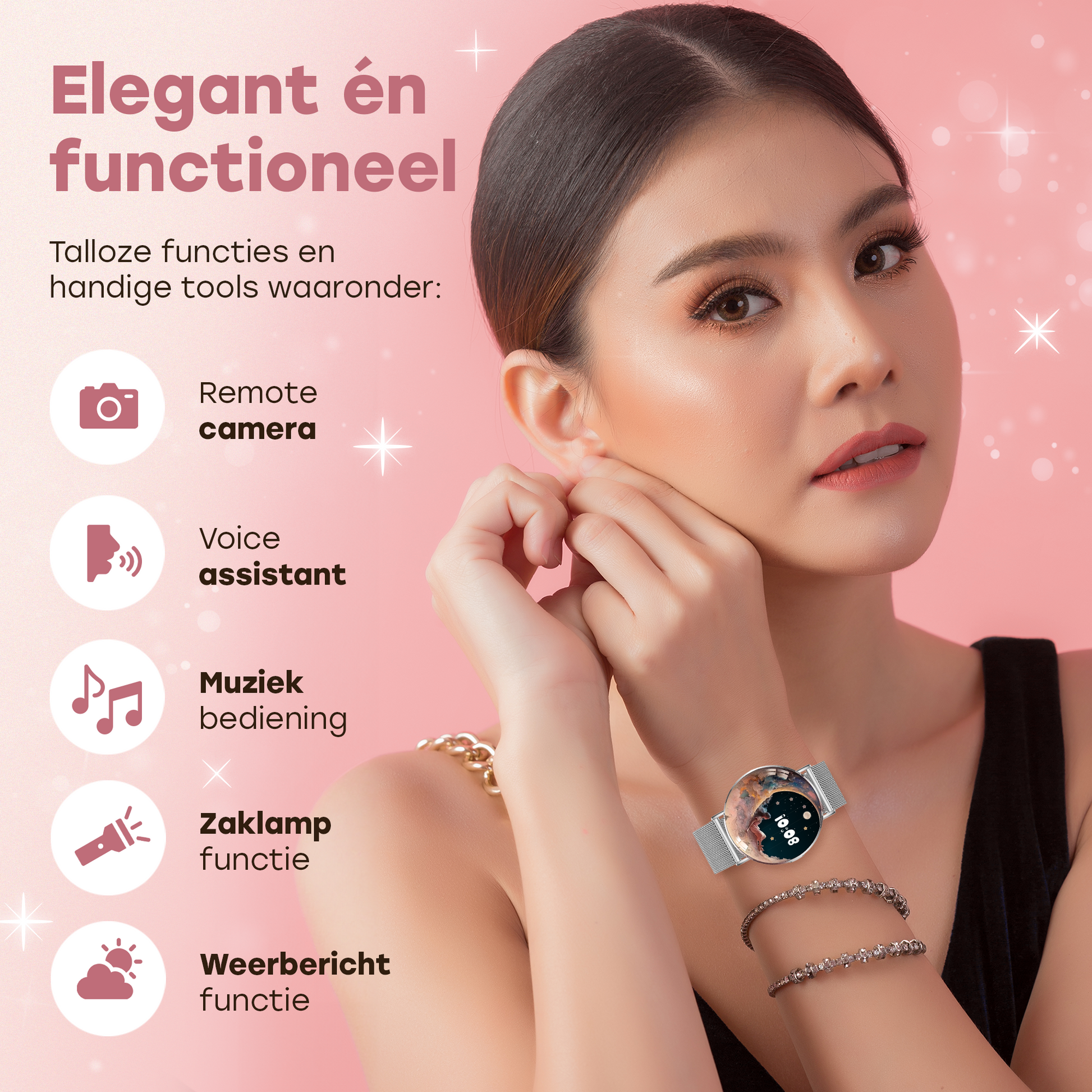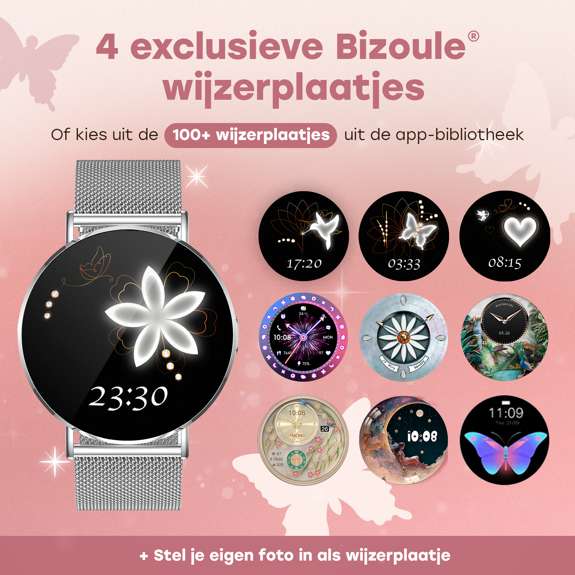 Met de Bizoule smartwatch Lunita ben je altijd in de juiste stijl. Het 1,32 inch Amoled beeldscherm met 3D dynamic UI display biedt een prachtig helder display en een unieke dynamische gebruikersinterface. Met 3 meegeleverde bandjes, en keuze uit 4 exclusieve Bizoule wijzerplaatjes, of de 300 wijzerplaatjes uit de app-bibliotheek kies je op elk moment jouw perfecte stijl. Het klokje heeft een chique matte afwerking en een ultradun en lichtgewicht design. Zo is deze smartwatch niet alleen super elegant en stijlvol, maar ook heerlijk comfortabel om te dragen, bij iedere gelegenheid.